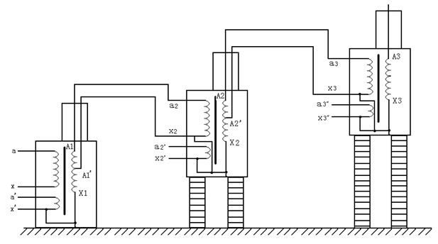 圖4:交直流油浸式試驗(yàn)變壓器原理圖 圖中:D – 短路桿 VD – 高壓硅堆 3. 串級(jí)油浸式試驗(yàn)變壓器接線及原理:如圖5 串級(jí)油浸式試驗(yàn)變壓器有很大的優(yōu)越性,三臺(tái)試驗(yàn)變壓器串級(jí)連接可獲得更高的電壓,因?yàn)檎麄€(gè)試驗(yàn)裝置由幾臺(tái)單臺(tái)試驗(yàn)變壓器組成,單臺(tái)試驗(yàn)變壓器容量小、電壓低、重量輕,便于運(yùn)輸和安裝。它既然可串接成高出幾倍的單臺(tái)試驗(yàn)變壓器輸出電壓組合使用,又可分開成幾套單臺(tái)試驗(yàn)變壓器單獨(dú)使用。整套裝置投資小,經(jīng)濟(jì)實(shí)惠。圖5中,在第一級(jí)和第二級(jí)的每個(gè)單元試驗(yàn)變壓器中都有一個(gè)勵(lì)磁繞組A1、C1和A2、C2。在串級(jí)試驗(yàn)變器基本原理圖中,低壓電源加在試驗(yàn)變壓器I的初級(jí)繞組a1x1上,單臺(tái)試驗(yàn)變壓Ⅰ、Ⅱ、Ⅲ的輸出電壓都是V。勵(lì)磁繞組A1、C1給第二級(jí)試驗(yàn)變壓器Ⅱ的初級(jí)繞組供電;第二級(jí)試驗(yàn)變壓器Ⅱ的勵(lì)磁繞組A2、C2給第三級(jí)試驗(yàn)變壓器Ⅲ的初級(jí)繞組供電。第二級(jí)試驗(yàn)變壓器Ⅱ和第三級(jí)試驗(yàn)變壓器Ⅲ的箱體分別處在對(duì)地為1V和2V的高電位上,所以箱體對(duì)地是絕緣的,試驗(yàn)變壓器I的箱體是接地的。這樣第一級(jí)、第二級(jí)、第三試驗(yàn)變壓器對(duì)地的額定輸出電壓分別為1V、2V、3V;其額定容量分別為3P、2P、1P。