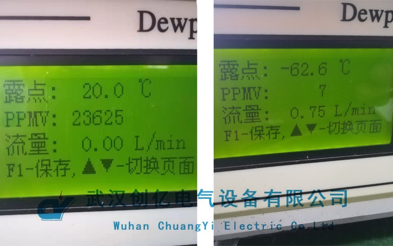 CYWS-242 SF6微水測量儀進行檢測時,先用高純氮清洗測量管道,通過調(diào)節(jié)測量管道上的針型閥,流量調(diào)節(jié)到0.75L/min,測出數(shù)據(jù):7ppmv;后續(xù)還對SF6新氣微水值也做了同樣測量,得出結(jié)果為11ppmv。兩項試驗均符合標準。